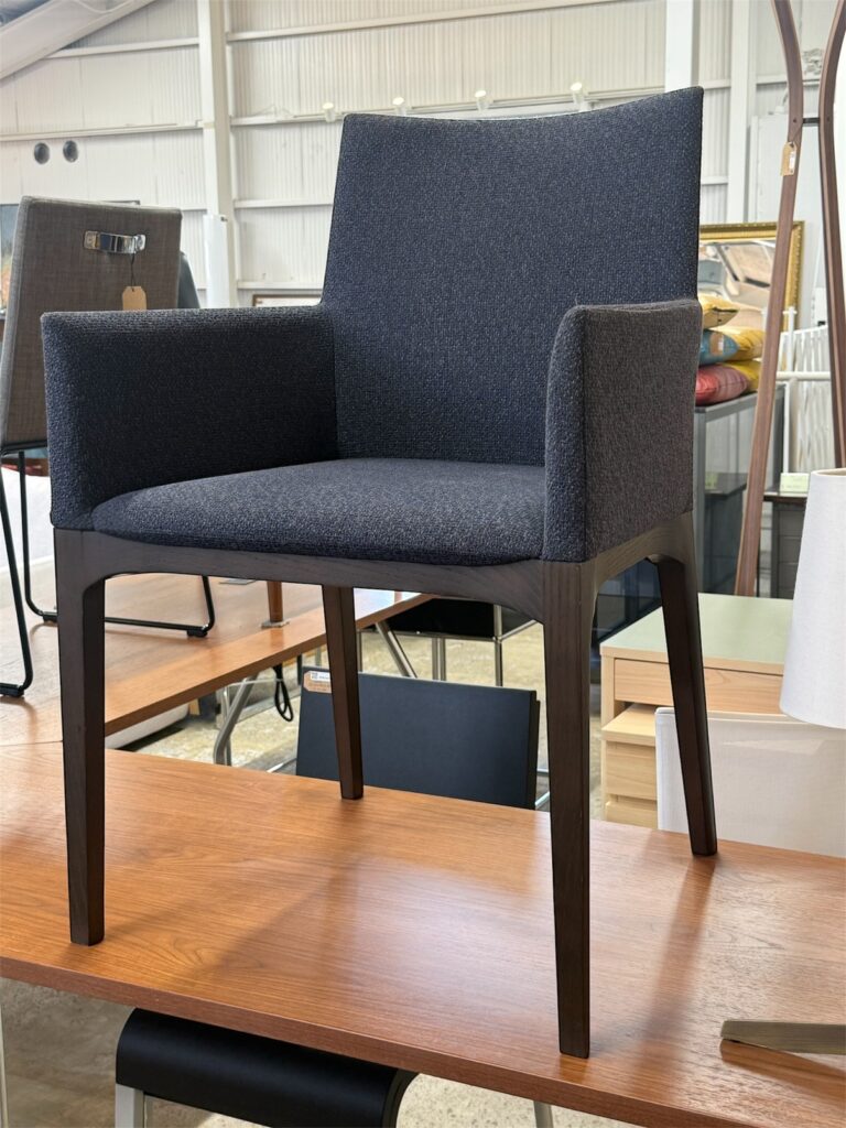 アームから脚にかけて流れるようなラインは、見る角度によって表情が変わり、まるで空間に線を描くような存在感があります。家具は生活の中に常にあるもの。だからこそ、毎日見ても飽きがこない美しさというのは、想像以上に大切な価値だと思います。