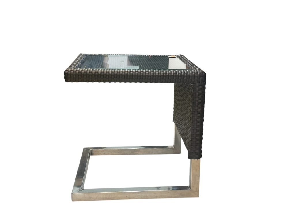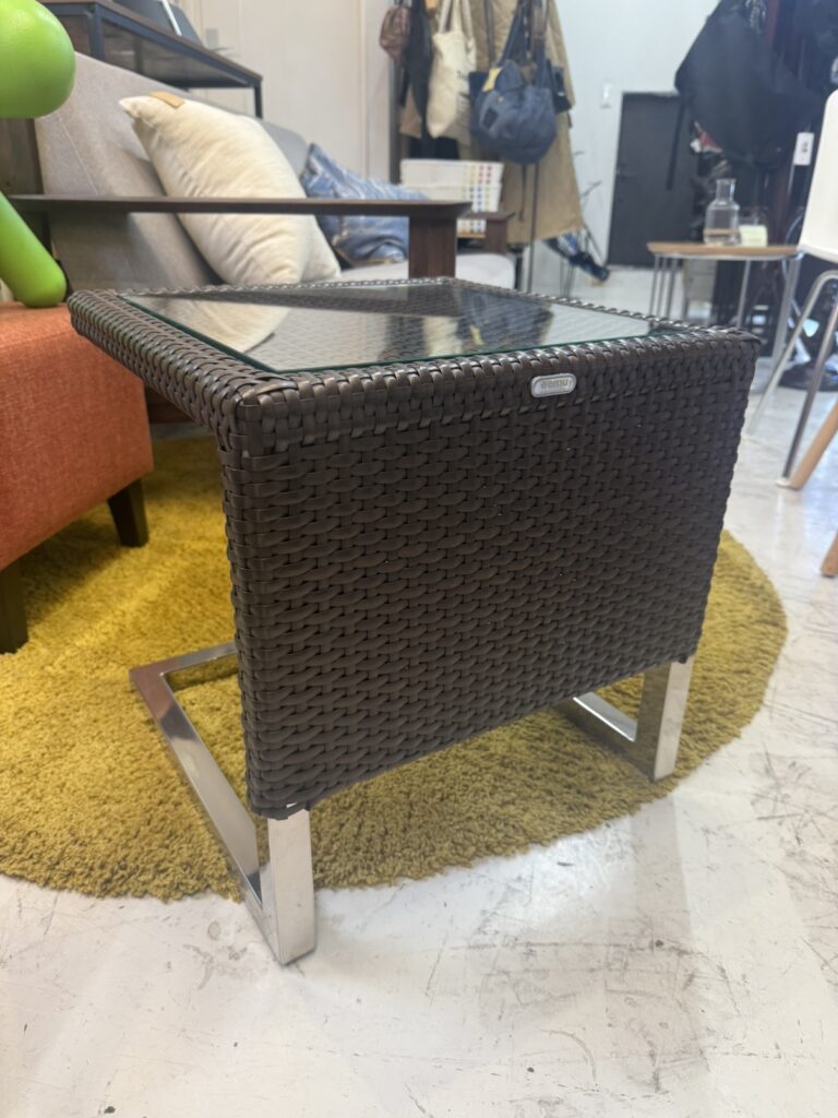 このサイドテーブルをおすすめする理由は、大きく3つあります。まずひとつ目は、空間に自然と溶け込むデザイン性の高さ。人工ラタンの編み込みデザインはナチュラルでありながら洗練されており、ガラス天板との組み合わせがモダンな雰囲気を演出してくれます。カフェのテラス席やオフィスのラウンジスペースなどにも違和感なくフィットします。