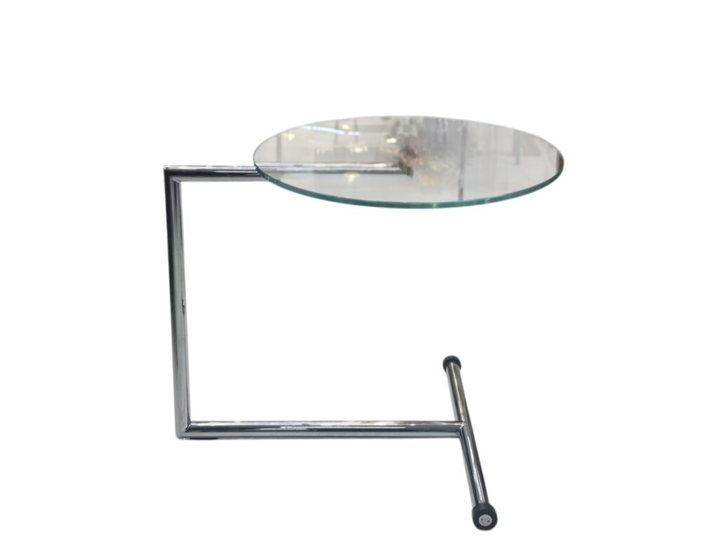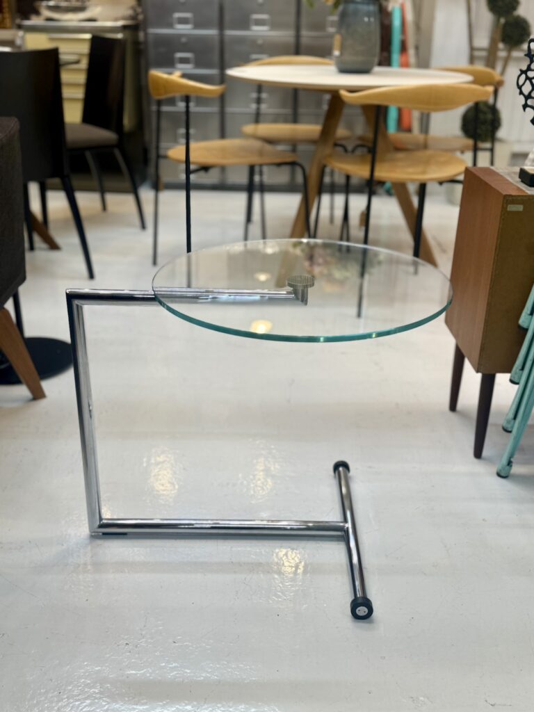 CORの「ALTE(またはARTE)」ガラスサイドテーブルは、透明な強化ガラス天板とクローム脚部が印象的な1台。